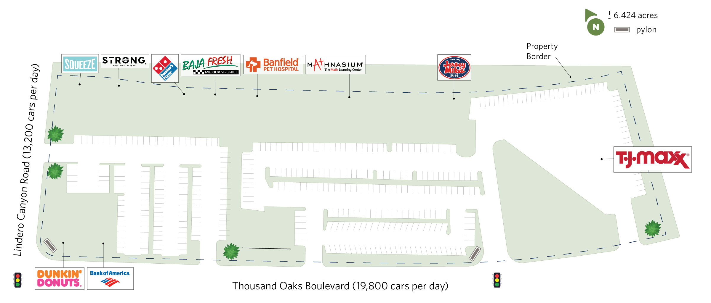 North Ranch Gateway is a shopping center in the affluent Los Angeles suburb of Westlake Village, CA. Located at the intersection of Lindero Canyon Road and Thousand Oaks Boulevard. It is anchored by T.J. Maxx and other tenants include Bank of America, Dunkin', Jersey Mike's Subs, Baja Fresh Mexican Grill, Mathnasium and Domino's Pizza. Within a 3-mile radius, more than 54,000 people with an average household income of $229,144 reside.