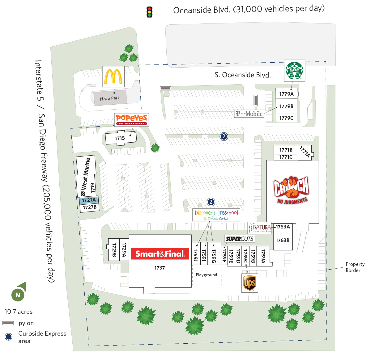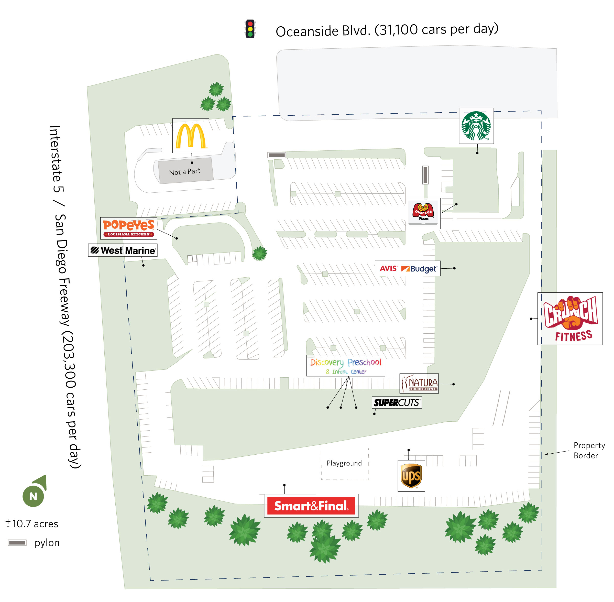 Major Tenants/National Retailers: Smart & Final, Crunch Fitness, Starbucks, Popeye's Louisiana Kitchen, West Marine, The UPS Store, Supercuts, Avis Budget Car Rental, Marco's Pizza